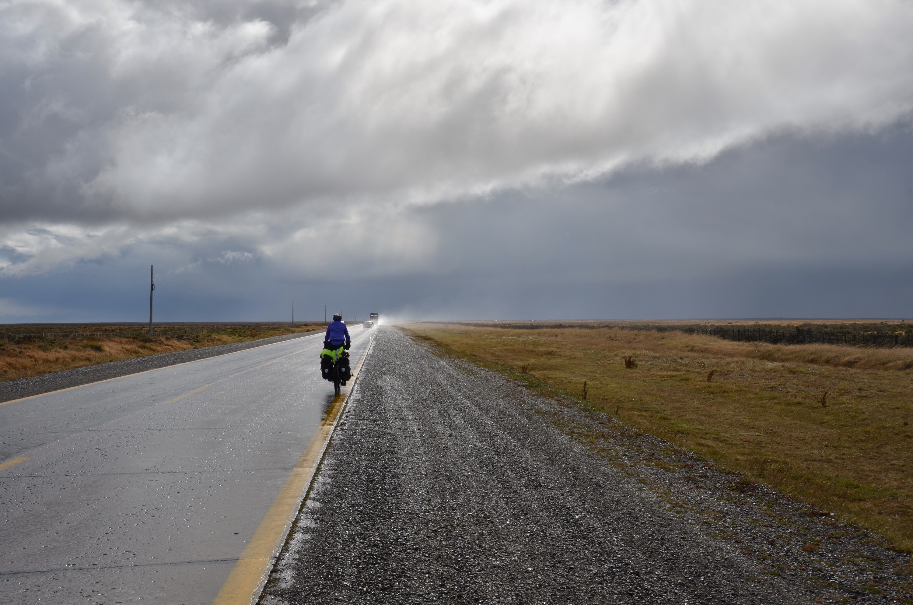 Gestärkt mit Omeletten, Brot und Kaffee verabschieden wir uns von Eduardo – unserem Hostal-Papa in Punta Arenas -, bepacken die Velos und nehmen noch etwas zaghaft die ersten Velo-Kilometer in Richtung Puerto Natales in Angriff. Ziemlich schnell verstehen wir, wieso Wind und Wetter das vorherrschende Thema unter den Veloreisenden hier unten ist. Die ersten Tage halten das ganze Potpurri Patagonischer Wetterkapriolen für uns bereit. Zufrieden stellen wir fest, dass die Ausrüstung hält was sie verspricht, Gore-Tex sei Dank.