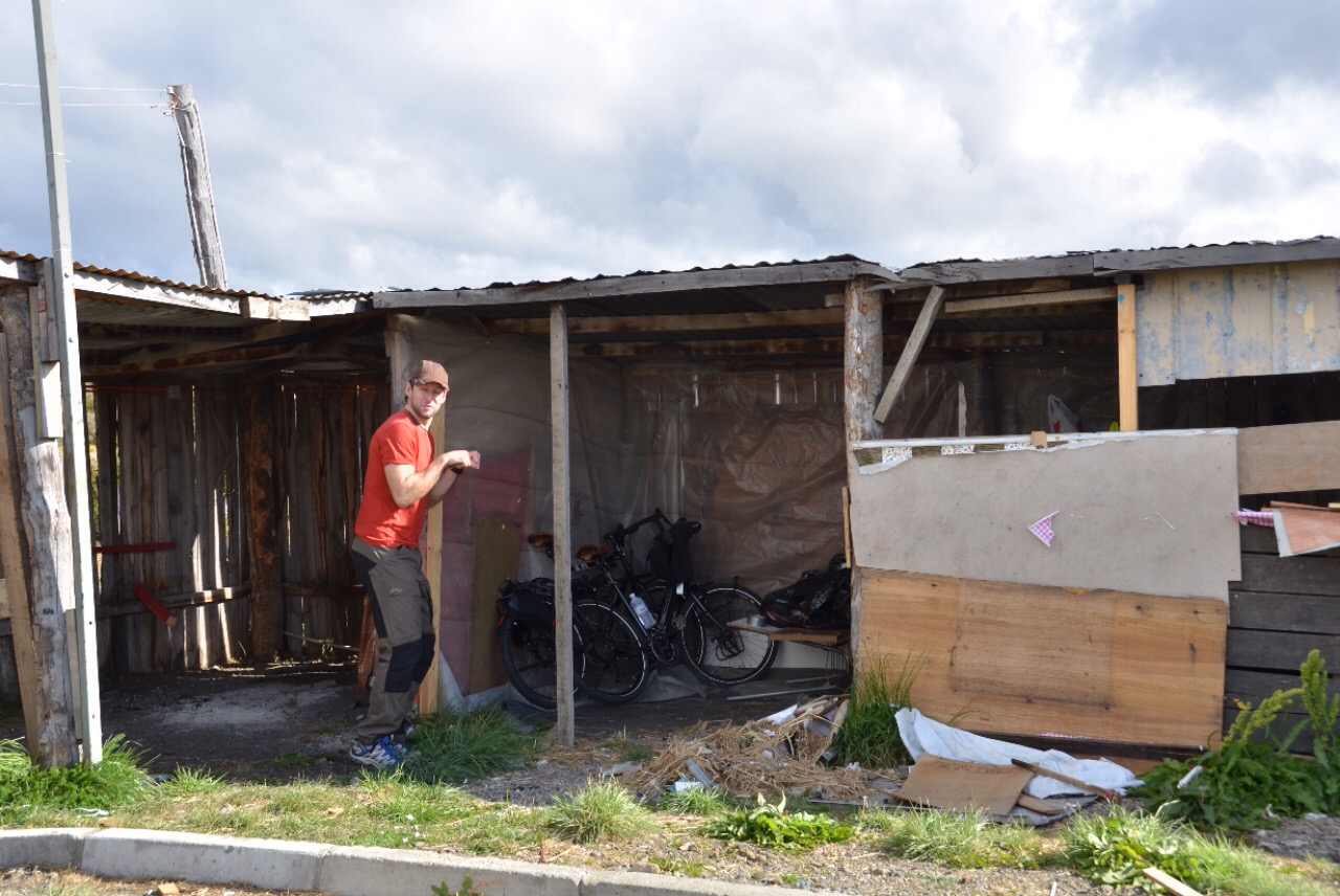 Eine Windböe fegt Corinne ins Kiesbett neben der Strasse und sie fängt sich den ersten Plattfuss ein. So kommt auch der Rep-Service bereits am ersten Tag zum Einsatz. Eine Baracke, die vielleicht mal ein Hostel-Zimmer war bietet uns Windschutz für die erste Nacht. Wir haben gehört, dass der Wind in den frühen Morgenstunden weniger stark ist, was wir am folgenden Tag ausprobieren wollen. Als wir um 8 Uhr losfahren, regnet es in Strömen, dafür haben wir praktisch keinen Gegenwind und geniessen die ruhigen Morgenstunden mit mystischer Stimmung.