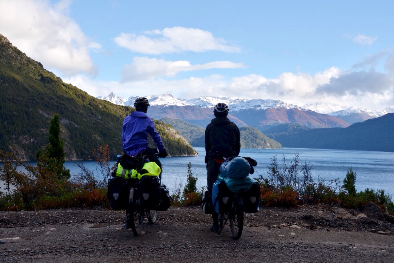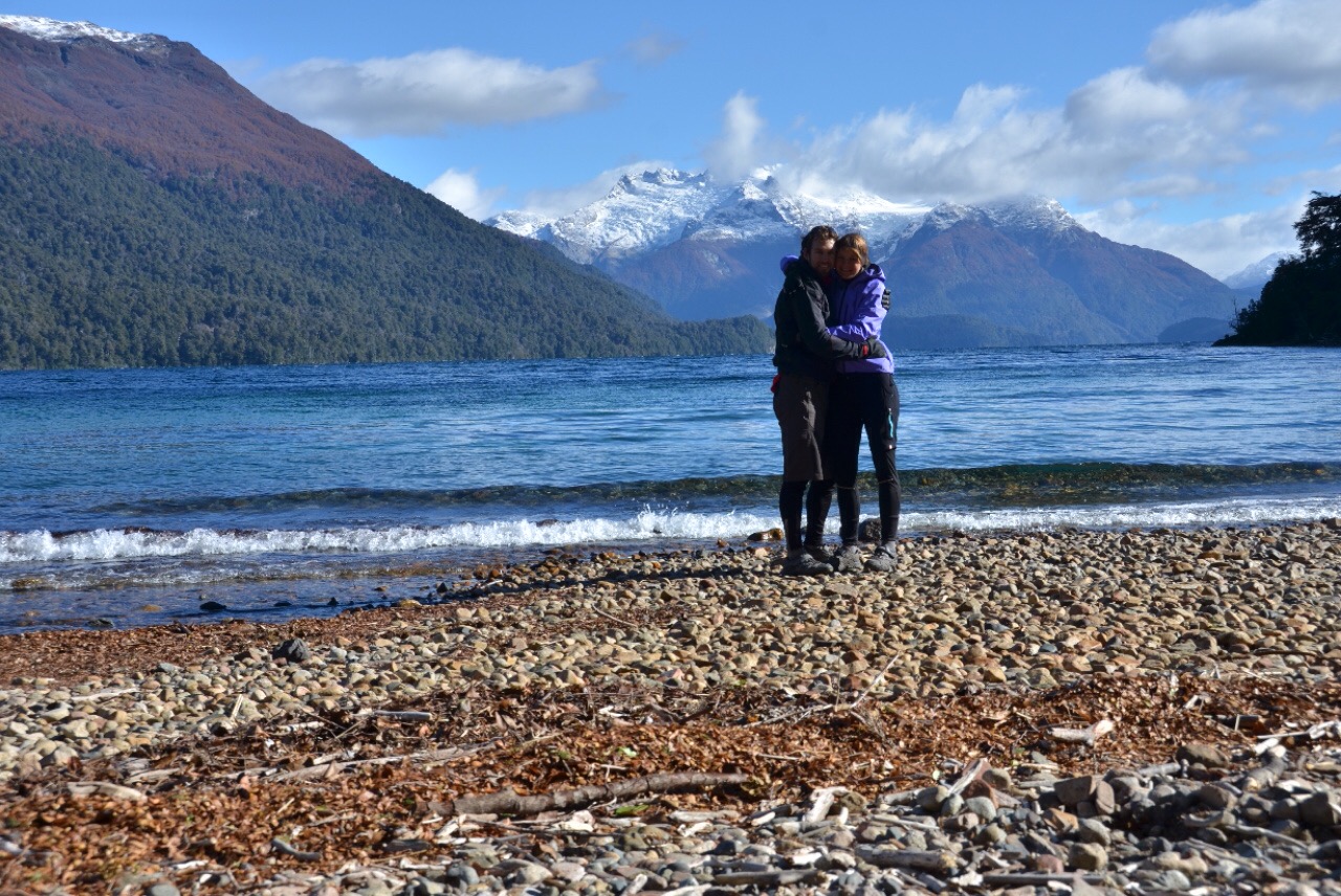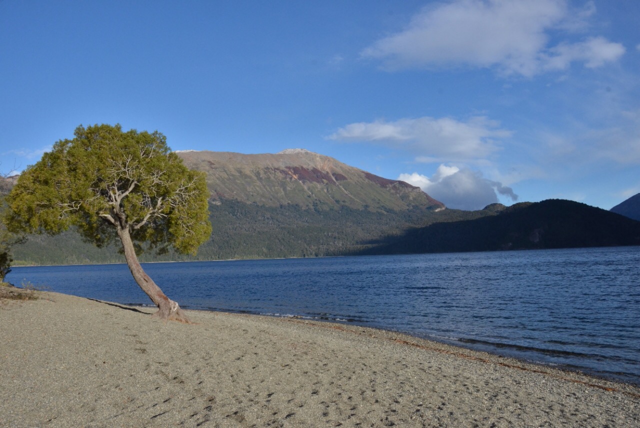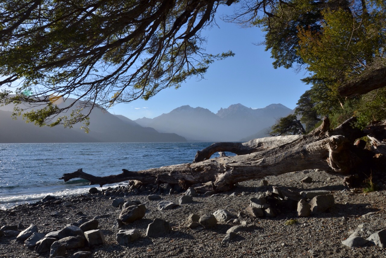 Die Temperaturen sind über Nacht weiter gesunken, lediglich die Seenähe hat uns vor Frost bewahrt. Finger und Füsse sind auf dem Velo im Nu zu Eiszapfen geworden, und es dauert bis zum Mittag, ehe die Wärme und das Gefühl zurückkommen. Vor der Mittagspause – wir sind mittlerweile in der Park-Mitte angelangt – machen wir einen stündigen Spaziergang durch den Wald zum Lago Menendez, von wo man eine super Sicht über den See auf Berge und Gletscher hat.