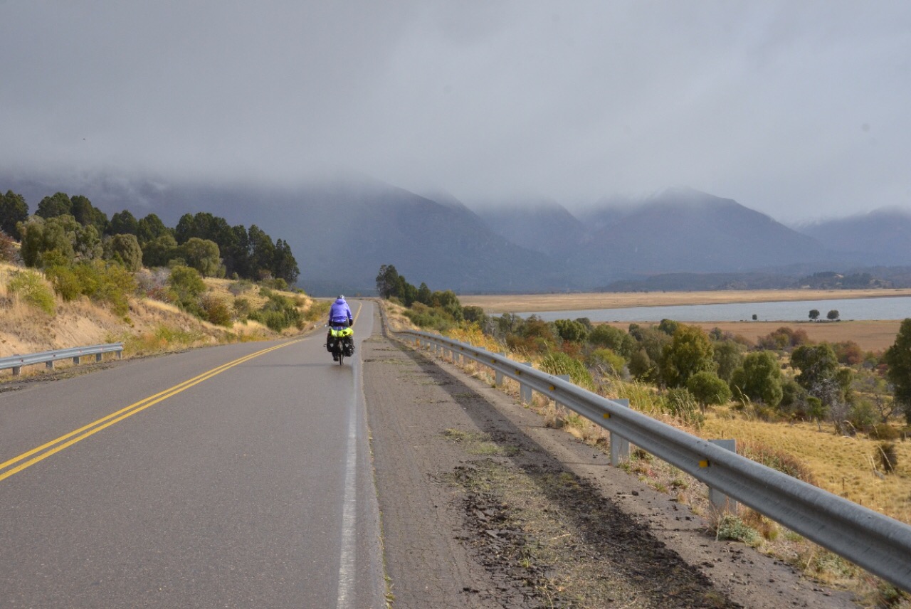 Die Entscheidung für oder gegen Regenkleider fällt heute leicht, mit dem Morgenrot verschwinden die letzten Flecken blauen Himmels und von Westen nähern sich dunkle Regenwolken. Bevor wir losfahren können, muss noch die eine Saccosche geflickt werden, die letzte Schotterpistenpassage war für die eigentlich unzerstörbaren Ortlieb-Taschen doch zu viel des Guten und eine Schraube hatte sich gelöst. Pünktlich als wir aus Trevelin rausfahren, setzen die Regenschauer ein.