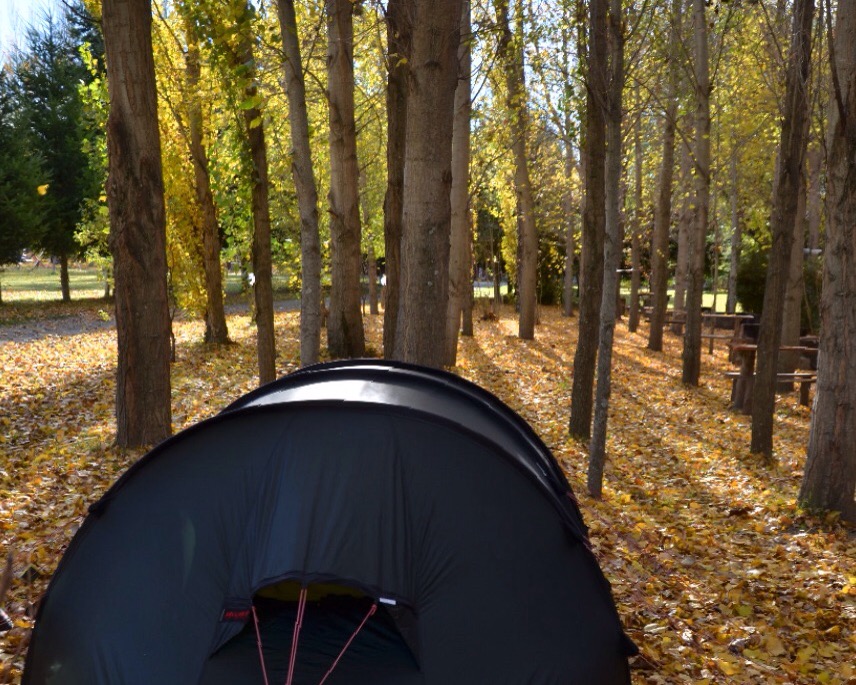 Unser Zelt stellen wir inmitten von hohen Pappeln auf, der Boden ist bedeckt mit gelbem Laub und bietet wunderbares Herbst-Feeling.