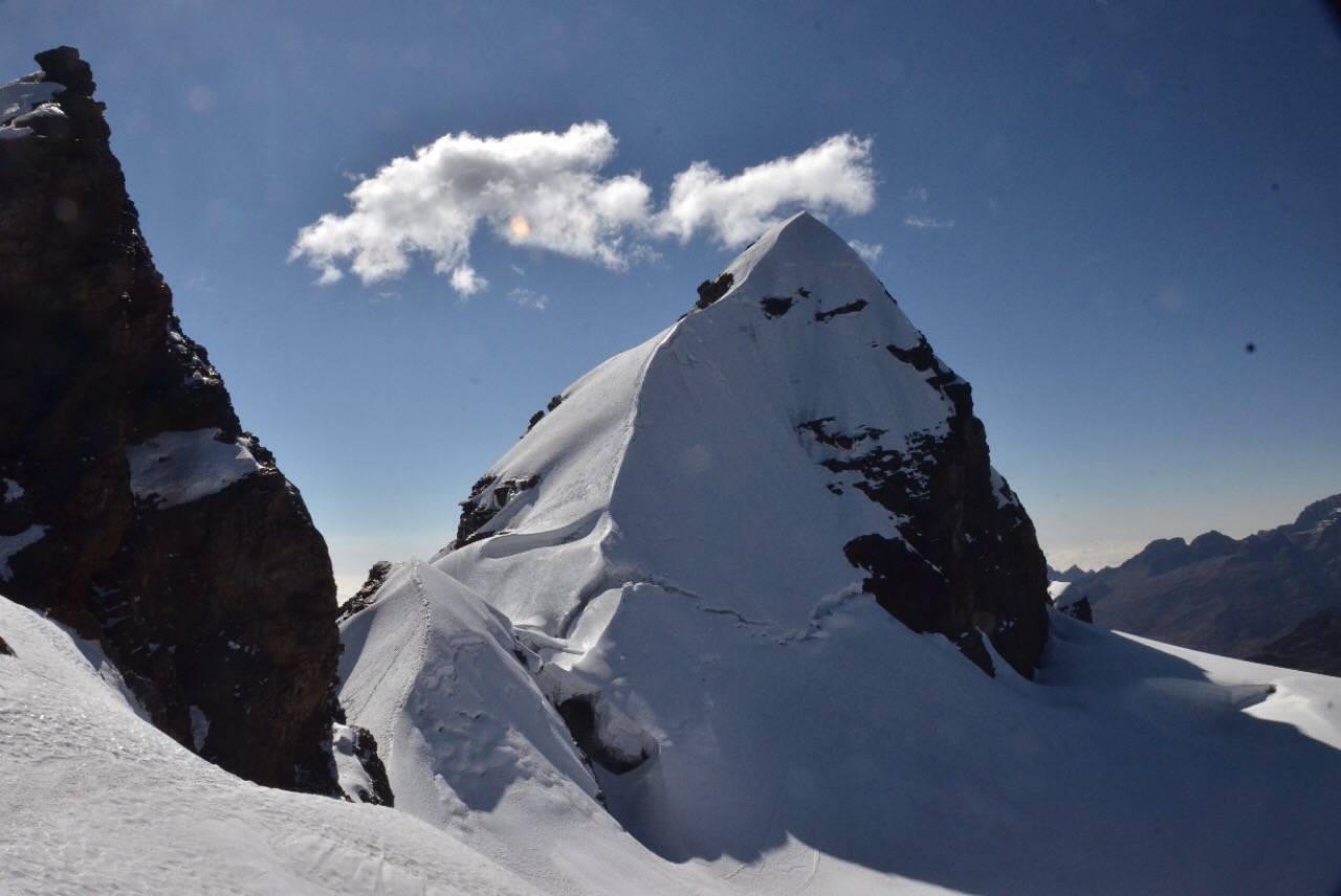 Zum Glück sind wir mittlerweile gut akklimatisiert, denn diese letzten Höhenmeter lassen uns doch ziemlich ins schnaufen kommen. Nach etwa fünf Stunden stehen wir auf dem Gipfel des Pequeño Alpamayo auf 5425 Metern, geniessen die wunderbare Aussicht und die wärmenden Sonnenstrahlen.