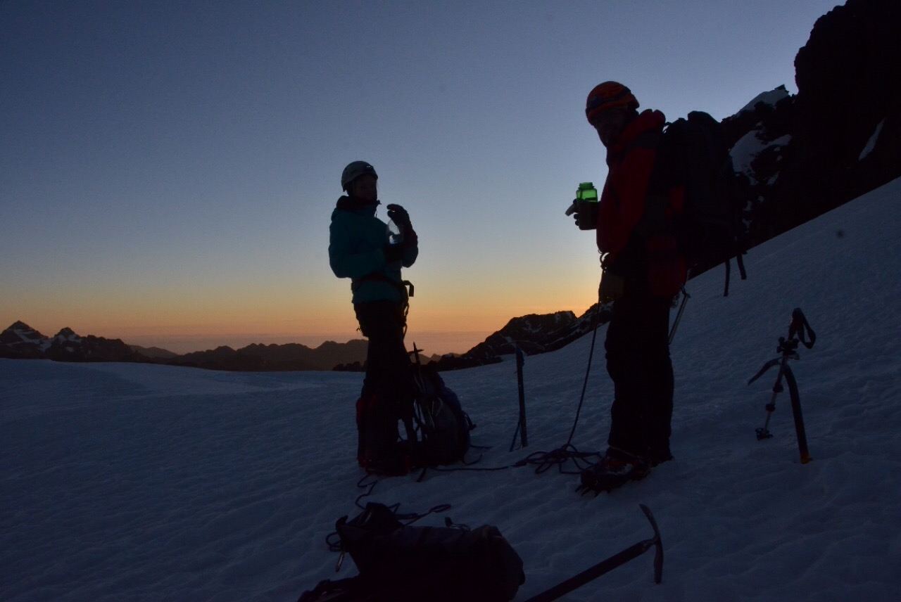 Mit dem Sonnenaufgang kurz vor sieben haben wir die meisten Höhenmeter bereits überwunden, auf uns wartet noch der technische Teil der Tour. Wir müssen über eine kurze Felspassage runterklettern, ehe wir einen letzten steilen Eisgrat vor uns haben.