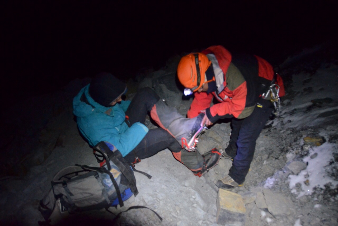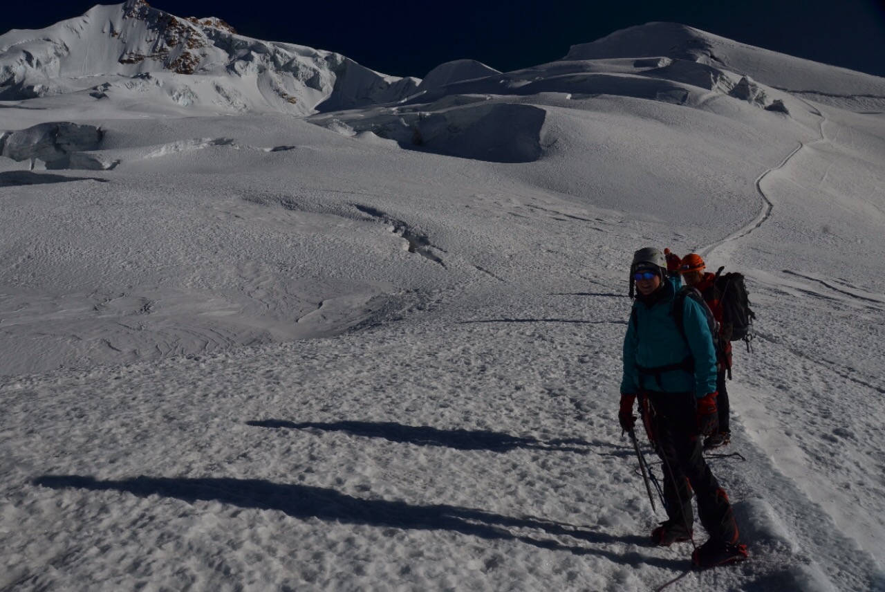 Unsere Köchin, ausgerüstet mit Ballerinas und in traditioneller Kleidung, ist ebenfalls vor uns und so wartet bereits heisser Tee auf uns als wir das Base-Camp erreichen. Am Nachmittag testen wir unser Material bei einem nahen Gletscher und erhalten von Jesus die Infos zur morgigen Tour.