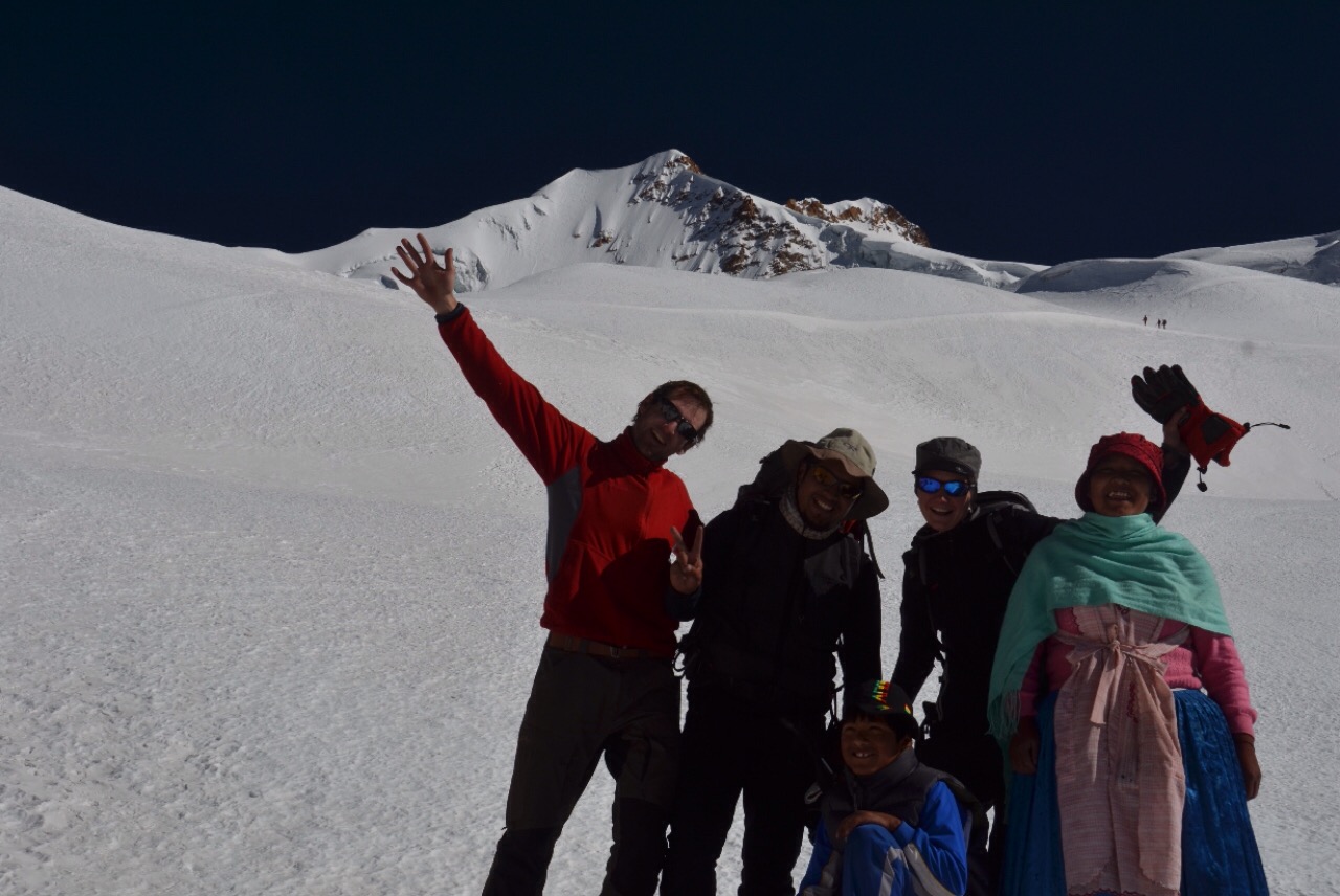 Trotz seinen Bremsversuchen erreichen wir bereits um sechs Uhr den Gipfel, als erste Gruppe und gut eine halbe Stunde vor Sonnenaufgang. Zum Glück ist es Windstill und nicht allzu kalt. Die Aussicht ist absolut atemberaubend, wir sehen hunderte Kilometer weit hinunter in den bolivianischen Jungel auf die eine Seite, ins Altiplano und zum Titicaca-See auf die andere Seite.
