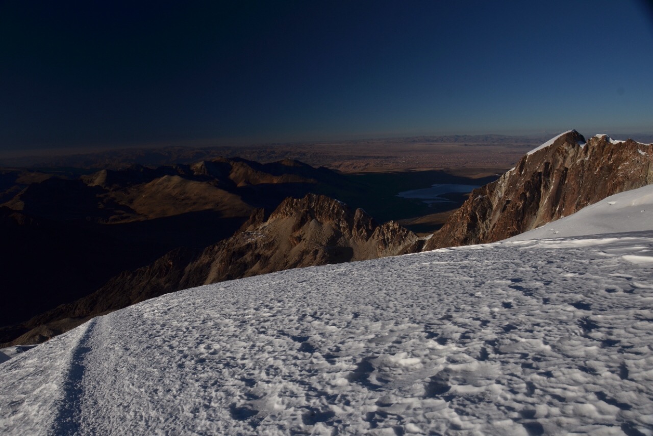 Der Abstieg wird im obersten Teil fast ebenso anstrengend wie der Aufstieg, die steile Eiskante erfordert nochmals unsere volle Konzentration.