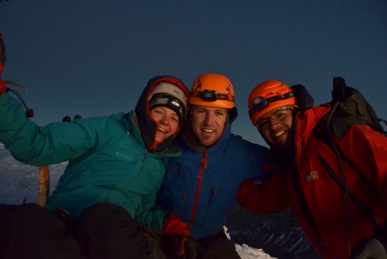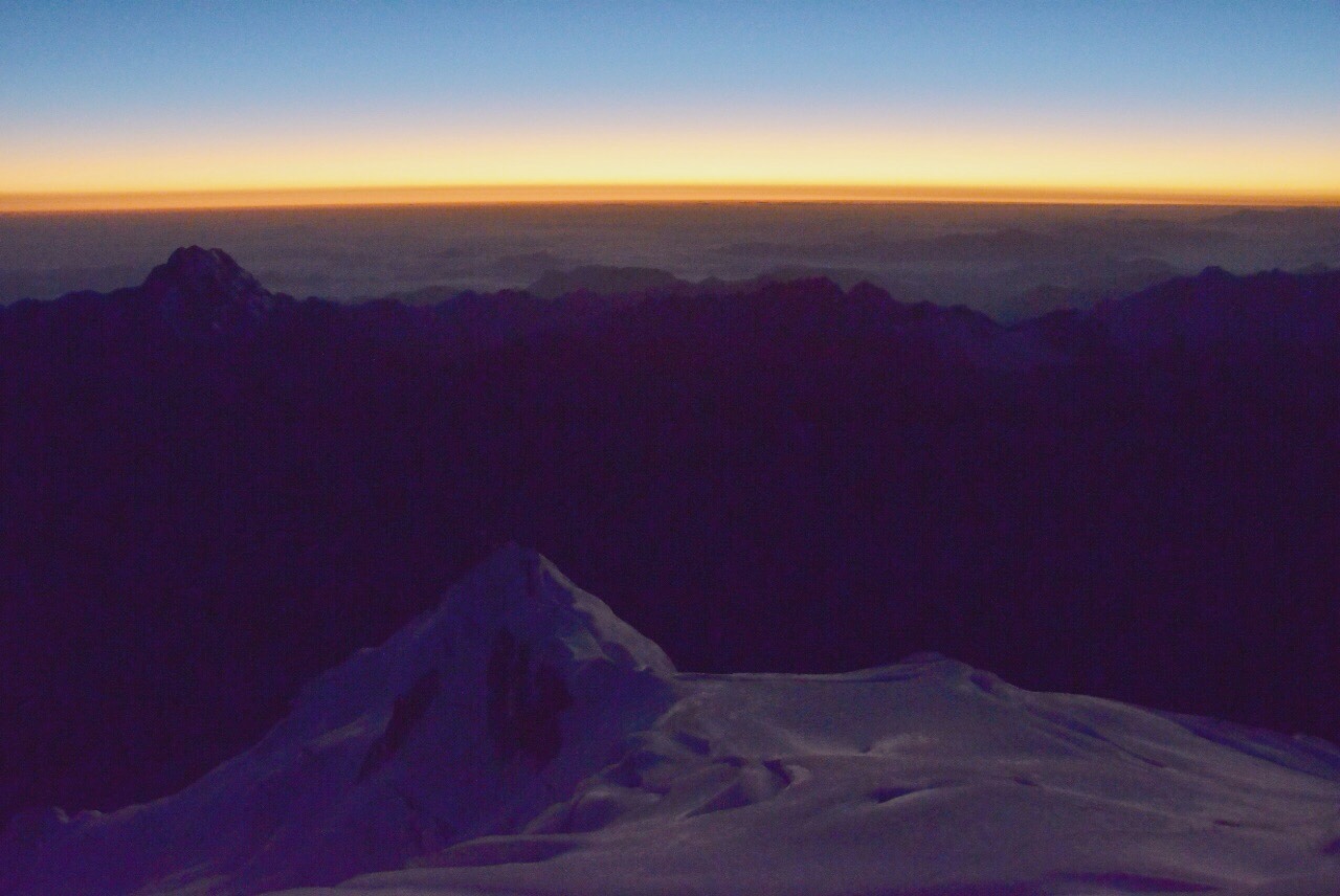 Etwa 15 Zweier- oder Dreierseilschaften machen sich in dieser Nacht auf den Weg, die ersten starten bereits kurz nach Mitternacht. Wir sind – so Jesus’ Einschätzung – etwas schneller unterwegs und starten als letzte Gruppe um 3:00 Uhr mit dem Aufstieg. Auf dem gut ausgetretenen Pfad auf dem Gletscher kommen wir schnell voran, nach zwei Stunden haben wir bereits die meisten Gruppen überholt. Jesus versucht uns mit zusätzlichen Pausen und langsamerem Lauftempo zu bremsen, sonst wären wir viel zu früh auf dem Gipfel. Und um lange auf den Sonnenaufgang zu warten ist es dann doch zu kalt.