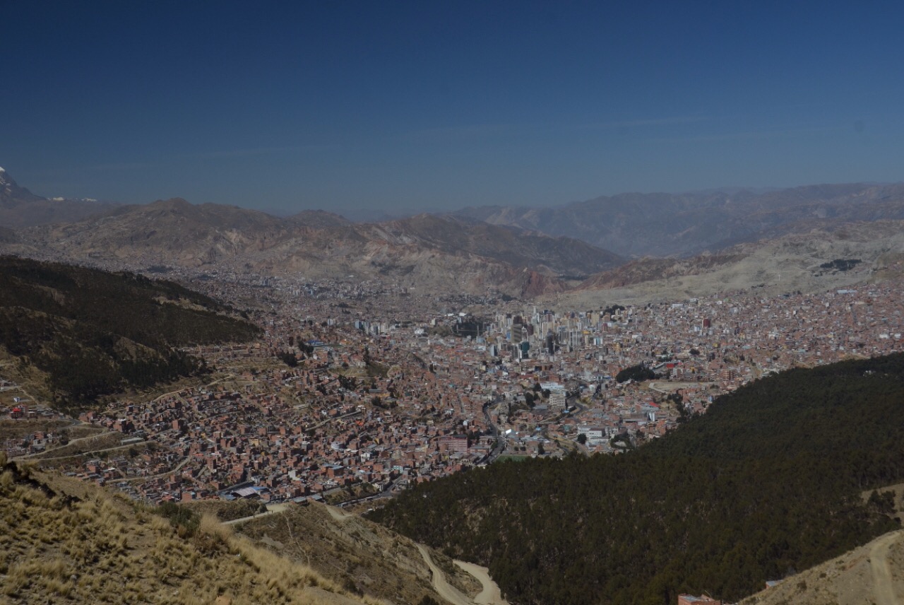 Man fragt sich, wer auf die Idee gekommen ist, eine Grossstadt ins enge Tal des Rio Choqueyapu zu placieren. Vor allem, wenn rundherum auf dem Altiplano mehr als genügend Platz vorhanden wäre. In ebenem Gelände wohlgemerkt. Die Spanier seien Schuld, lassen wir uns sagen. Es gibt auch andere Erklärungen. Ändern lässt sich sowieso nichts mehr. Im Talgrund ist gerade mal Platz für die zweispurige Hauptstrasse und ein paar Häuser, der Rest der Stadt schmiegt sich an die steilen Hänge.