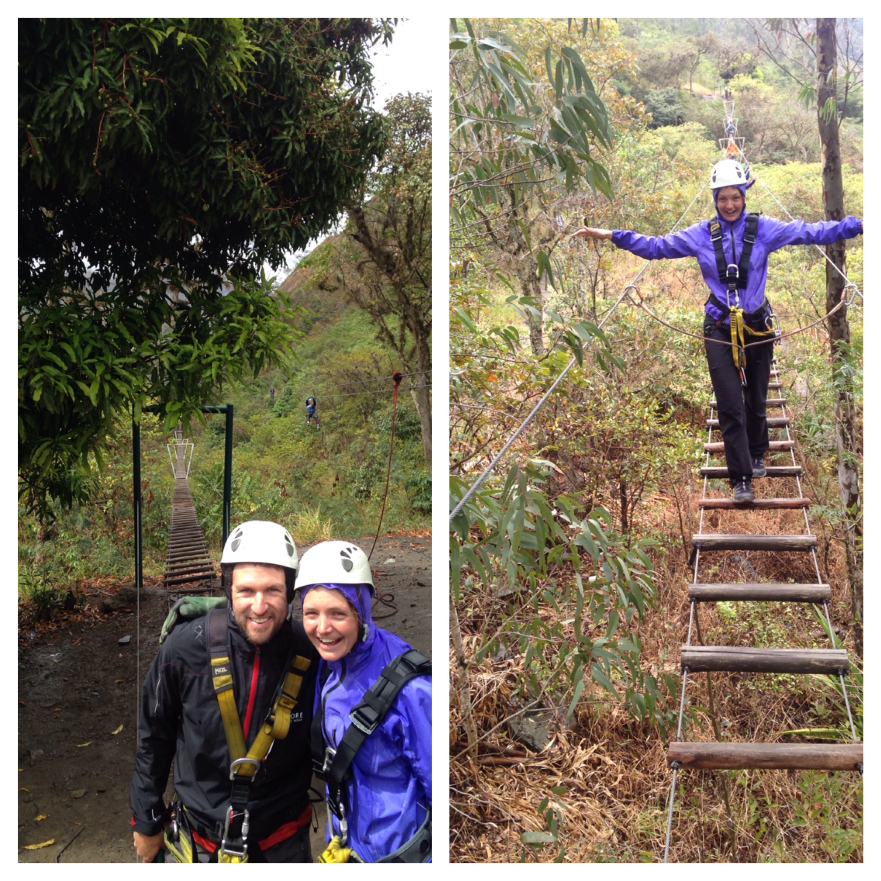Wir geniessen das gemütliche Wandern – Selfiestick und GoPro unsere Gruppe sei dank, kommen wir immer wieder zu Foto-Aussichts-Stopps. Schliesslich gelangen wir auf einen alten Inka-Pfad, welcher sich in schwindelerregender Höhe über dem Fluss einer Felskante entlang schlängelt. Zuoberst angekommen führt uns Abi in ein für sie sehr bedeutendes Ritual zur Ehre der Pachamama ein – ein spezieller Moment, der uns ein bisschen in die indigene Kultur eintauchen lässt. Doch auch dieser Tag endet nicht ganz ruhig. Es gilt nur noch den Fluss zu überqueren. Eine Brücke gibts keine – die letzte wurde von einem grossen Hochwasser vor knapp zwanzig Jahren weggespült. Aber was es gibt, ist ein kleines Transportbähnchen oder eher eine Holzkiste, in welcher wir auf die andere Flusseite sausen. Belohnt wird die Überfahrt und der achtstündige Wandertag einmal mehr mit heissen Quellen, in welche wir dieses Mal ohne zu zögern freudig rein hüpfen.Die Wärme hält für die dampfige Tropen-Nacht, doch ist am nächsten Morgen schnell verschwunden. Ausgerüstet mit ‘Gstältli’ und Kletterhelm flitzen wir in ca. fünfzig Metern Höhe an den Zip-Lines über das Flusstal. Die Länge der Kabel lässt ein geniales Fluggefühl aufkommen – nur die ewig scheinende Hängebrücke über die Baumwipfel ist dann eher auf der wackeligen Seite.