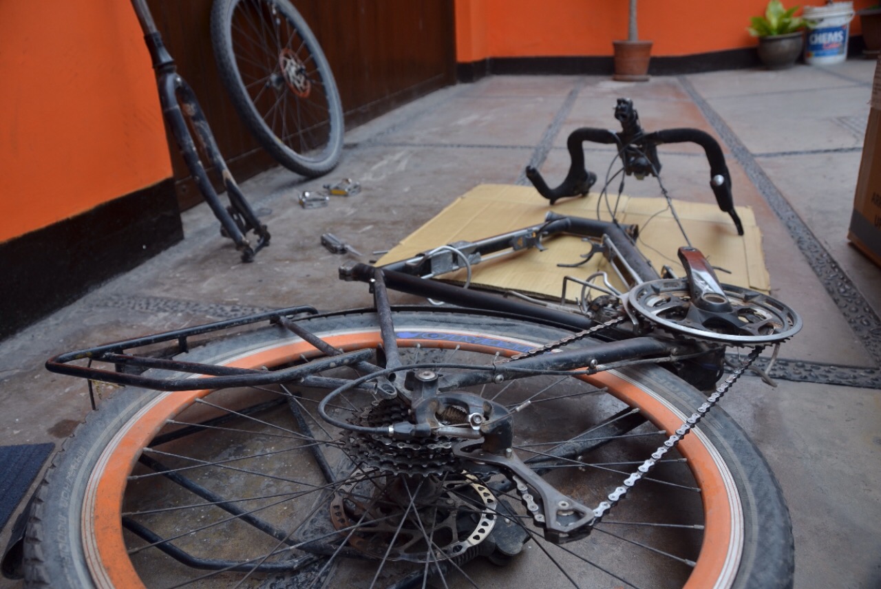 Samstagmorgen, wir versuchen unsere Fahrräder fertig zu verpacken.