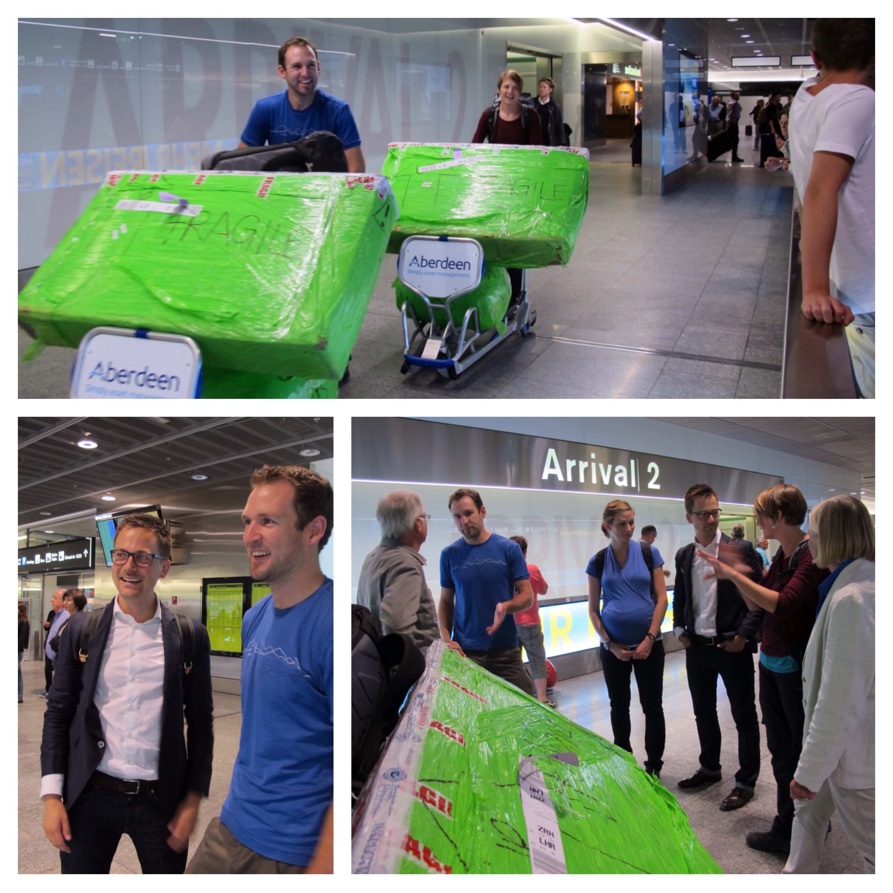 Wirklich auf dem Boden sind wir noch nicht, obwohl wir beladen mit unseren vier knallgrünen Gepäckmonstern kurz vor dem Ausgang am Flughafen Kloten stehen. Von Realisieren kann noch lange nicht die Rede sein, aber von einer wunderschönen Überraschung, als wir hinter der Schiebetüre unsere Eltern und Gregi und Barbara entdecken. Das sind die wunderbaren Momente, wenn die lieben Menschen wieder in die Arme geschlossen werden können – und plötzlich wieder alle Schweizerdeutsch sprechen.